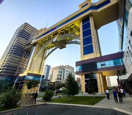 “和盛金刚馆”是把道路两旁的住宅在17层高度上连起来的高架桥餐厅,远处看是和盛三期的大型门柱,非常气派,很像新加坡的连廊金沙酒店。两头塔式立柱内有电梯直达17层的挑空连廊,长90余米,宽10来米的高空空间是通透的餐厅,装饰豪华。两个塔式立柱之间有弓形的桥状架子,中间挂有大型钟表,增添朝鲜建筑设计的高雅水准。这家餐厅是今年4月25日开张的,据说两侧靠窗户的位置不提前预约就排不上,高空上俯视两侧的住宅群的确很壮观。紧挨着有亚美山汽车技术服务店、和盛电子游戏厅、和盛乐园烧烤店等各种现代化服务设施。餐桌的椅子下面是钢化玻璃,可以看到下面的道路和川流不息的车辆,略带有惊险之感。
